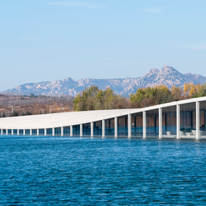 Erguido sobre um lago artificial na China, o museu faz da superfície d’água parte ativa da experiência espacial. O piso, concebido como uma nova paisagem, acolhe o lago em seus interiores, exigindo soluções técnicas refinadas para garantir estabilidade, conforto e durabilidade.